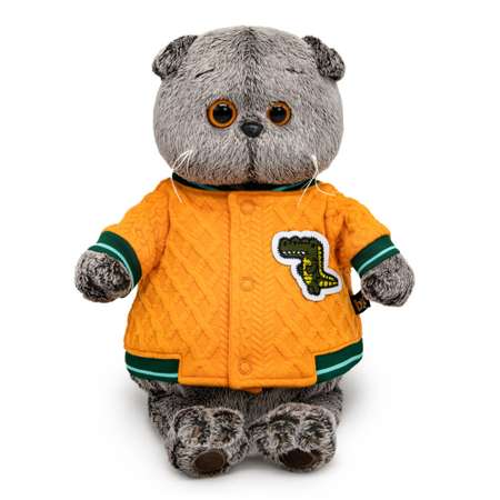 Басик в шикарном бомбере из рифлёного трикотажа цвета апельсина. Бомбер сшит с контрастными трикотажными вставками в изумрудных оттенках, спереди с застежкой на невидимые кнопки. Сбоку бомбер украшает классная нашивка в виде крокодильчика. Игрушка поставляется в подарочной упаковке.