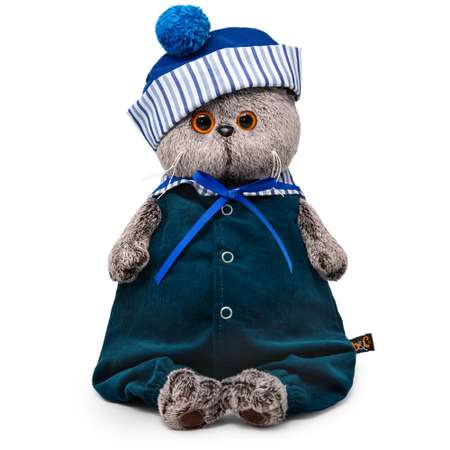 Кот Басик в уютном комплекте в морском стиле. На Басике вельветовый комбинезон цвета морской глубины, спереди с застежкой на кнопки, морской воротник «Гюйс» с завязкой на бант, морская шапочка с полосатым отворотом и помпоном. Игрушка поставляется в закрытой подарочной коробке, подвязанной атласными лентами.