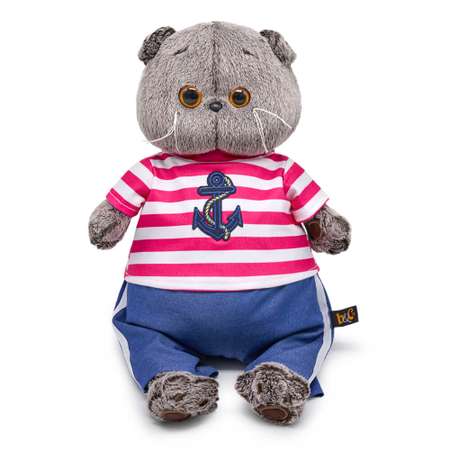 Кот Басик в трикотажной футболке в розово‑белую полоску с нашивкой спереди в виде якоря. Также на Басике модные синие штаны с белыми лампасами. Игрушка поставляется в подарочной упаковке.