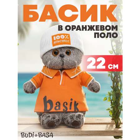 Очень стильный кот Басик в оранжевом поло с надписью «basik» (Басик), с воротничком и манжетами из плотной трикотажной резинки с белой полосой. На голове Басика белоснежная шапочка из вязаного трикотажа с нашивкой «100% антистресс»