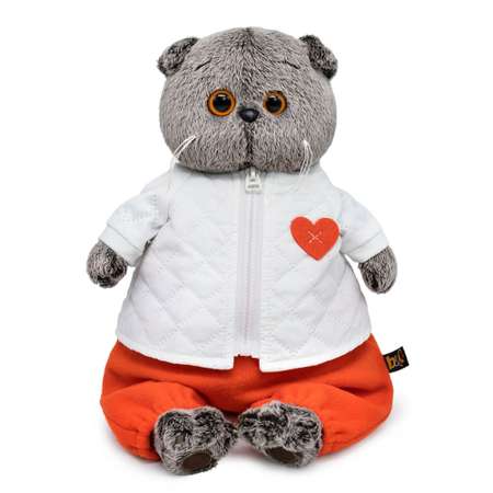 Кот Басик в невероятно стильном комплекте. Белоснежная курточка на молнии, сшитая из болоньи со стёганным эффектом. Курточку украшает милое оранжевое сердечко из фетра. В комплекте уютный ярко‑оранжевый комбинезон из мягкого флиса, сшитый на лямочках с пуговками и резиночками по низу штанин. Игрушка поставляется в закрытой подарочной коробке, подвязанной атласными лентами.