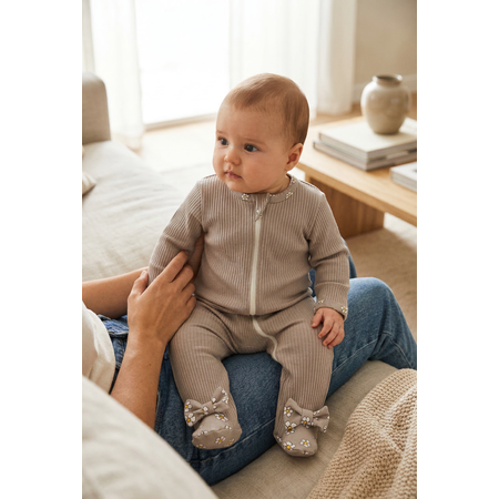 На ножках милые декоративные бантики добавляют очарования. Комбинезон застегивается на удобную молнию, а защитный язычок на горловине предотвратит царапины нежной кожи. Антицарапки на ручках у комбинезона в размере 56-62 защитят малыша от случайных царапин. Размер 62-68 и 68-74 швы внутрь, ножки закрыты.