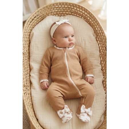 На ножках милые декоративные бантики добавляют очарования. Комбинезон застегивается на удобную молнию, а защитный язычок на горловине предотвратит царапины нежной кожи. Антицарапки на ручках у комбинезона в размере 56-62 защитят малыша от случайных царапин. Размер 62-68 и 68-74 швы внутрь, ножки закрыты.