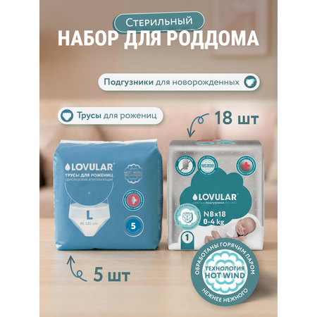 Этот тщательно подобранный комплект разработан с учетом всех потребностей мамы и обеспечивает максимальную гигиену и удобство, позволяя вам сосредоточиться на самом главном – вашем малыше. В составе набора- Стерильные подгузники LOVULAR Hot Wind NB 18шт, Стерильные Трусы для рожениц LOVULAR L 5шт