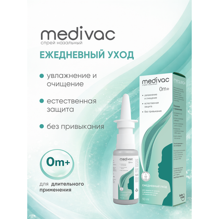 Medivac Ежедневный уход 0+ — это изотонический солевой спрей на основе озерной соли концентрацией 0,9%, предназначенный для ежедневного ухода за слизистой оболочкой носа и носоглотки с первых дней жизни.