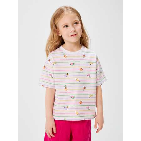 Детская футболка в цветную полоску для девочки — это яркая и стильная деталь гардероба для создания летних образов. Футболка выполнена из легкой и воздушной кулирной глади, которая отлично подходит для жаркой летней погоды. Модель отличается свободным кроем для более комфортного ношения: в ней приспущена линия плеча, а также увеличены объем и длина рукава. Всё это дарит легкость движений, которую особенно оценят по достоинству активные непоседы. Удобная округлая горловина не мешает при одевании. Разноцветная полоска дополнена узором с изображением ярких фруктов, который добавит образу задорную нотку. Принт на водной основе не теряет красок и не трескается при стирках, а значит, будет долго радовать своим цветом. Комбинируйте футболку в образе с яркими брюками и удобной обувью.