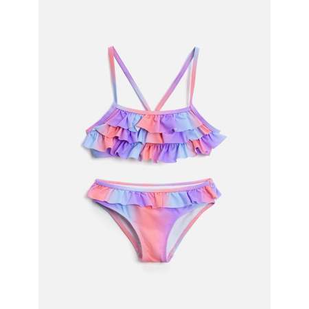 Детский раздельный купальник с оборками для девочек — это стильная и красочная модель для создания незабываемых пляжных образов. Купальный костюм выполнен из эластичной ткани, которая прекрасно сохраняет форму и цвет, позволяя беззаботно проводить время на солнце. Материал также быстро сохнет, что добавляет комфорта в отдых. Купальник состоит из топа и плавок. Топ на тонких бретелях, которые перекрещиваются на спинке, под нашитым декоративным бантиком. Перед украшают три ряда оборок из основного материала, которые придают легкий и воздушный акцент. Плавки классической формы со средней посадкой удобны для разных типов фигуры. Верхний край также дополнен декоративными оборками. Купальник для девочки с градиентным окрашиванием позволит создать незабываемый пляжный образ. Модель представлена в двух вариантах: разноцветном и бежевом.