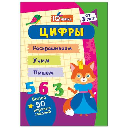 Блокнот с заданиями "IQничка. Цифры и счёт. Более 50 игровых заданий: Раскрашиваем. Учим. Пишем. От 3 лет" для детей разного возраста представлен в виде страничек с увлекательными игровыми заданиями, направленными на развитие навыков счета и знакомство с цифрами.
