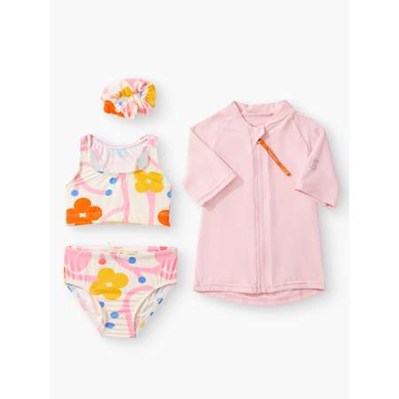 Комплект для девочки выполнен из эластичных материалов, которые обеспечивают комфорт при движении. Ткань быстро сохнет и подходит для активного отдыха. Раздельный купальник удобно сидит и не сковывает движения. Футболка для девочки на молнии облегчает надевание и обеспечивает дополнительный комфорт. Резинка для волос, выполненная в стиле купальника, дополняет комплект.