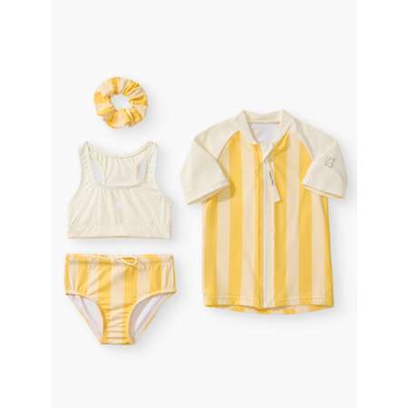 Комплект для девочки выполнен из эластичных материалов, которые обеспечивают комфорт при движении. Ткань быстро сохнет и подходит для активного отдыха. Раздельный купальник удобно сидит и не сковывает движения. Футболка для девочки на молнии облегчает надевание и обеспечивает дополнительный комфорт. Резинка для волос, выполненная в стиле купальника, дополняет комплект.