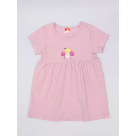 Платье со слегка завышенной линией талии, с коротким рукавом. Юбка, собранная по шву притачивания, слегка расширяется к низу. Круглая горловина окантована одноигольной бейкой из основного полотна. В плечевом шве застёжка на кнопки. Перед лифа оформлен ярким принтом.