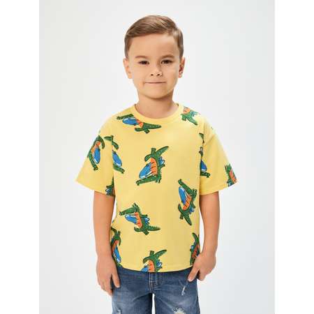Детская желтая футболка с крокодилами — это необычная модель для создания ярких образов. Футболка для мальчика изготовлена из принтованного трикотажного полотна, которое отлично подходит для длительного ношения. Изделие посадки комфорт отличается приспущенной линией плеча, а также увеличенными объемом и длиной рукава. Такой крой дарит возможность легко двигаться, что особенно ценят активные мальчики. Удобная округлая горловина не будет мешать при одевании. Вся футболка украшена ярким принтом с крокодилами, несущими доски для серфинга, что сделает летний образ красочным и добавит ему забавную нотку. Модель представлена в двух цветах: белом и желтом. Стилизуйте футболку в повседневном образе с джинсовыми шортами (20130550001) и удобной обувью.