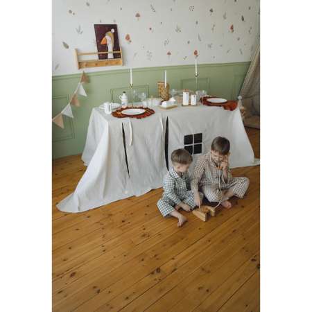 ети обожают строить разнообразные домики и шалаши из одеял и табуреток, поэтому скатерть-домик непременно приведет в восторг ваших маленьких непосед. Чехол натуральной ткани (хлопок/лен) не вызывает аллергии, размер 300х270 см, что отлично подойдет на размер любого стола.
