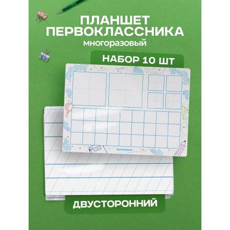 Многоразовый тренажер для письма «Планшет первоклассника», набор из 10 штук. Размер каждого тренажера – А4 (21х29,5 см). Планшеты двусторонние: с одной стороны находится тренажер для письма букв, с другой – цифр. Система «Пиши-стирай» делает тренажеры многоразовыми. А возможность потренироваться на планшете дает ребенку время выработать первичный навык правильного написания букв до того, как он начнет писать их в тетради. Помимо этого, тренажер способствует развитию мелкой моторики. Набор тренажеров подойдет для дошкольников и учеников 1 класса школы. Поставляется в брендированной коробке из плотного картона. Это защитит планшеты при транспортировке.