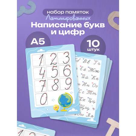 Памятки "Написание букв и цифр", 10 штук. Выполнены из плотной бумаги с ламинацией, формат А5 (21х14,8 см), скругленные углы. С одной стороны каждой памятки изображены 33 буквы русского алфавита, с другой – 10 цифр. Точками на картинках отмечено начало письма, стрелками отображено направление письма. Памятки помогут детям успешно освоить последовательность правильного написания цифр и букв. Они соответствует ФГОС для начальной школы, предназначены для занятий по учебнику В.Г. Горецкого. Такой набор станет приятным подарком учителю начальных классов или педагогу дополнительного образования.