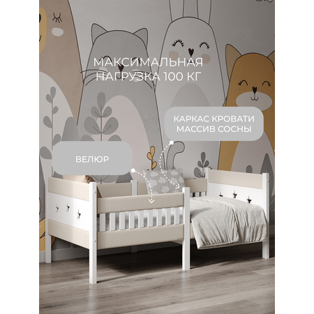 Каркас кровати изготовлен из крепкого массива сосны и укреплён дополнительными ножками, бортики изготовлены из ЛДСП с мягкой прослойкой из поролона и антивандального велюра. Прежде всего, стоит отметить, что все несущие элементы конструкции цельноламельные. Это значит, что они не являются срощенными, что обеспечивает высокую прочность и долговечность. Благодаря этому, кровать легко выдерживает распределенную нагрузку до 100 кг, что делает ее устойчивой и безопасной для использования. Дно выполнено в виде ламелей, что обеспечивает оптимальную поддержку позвоночника ребенка и способствует здоровому сну.