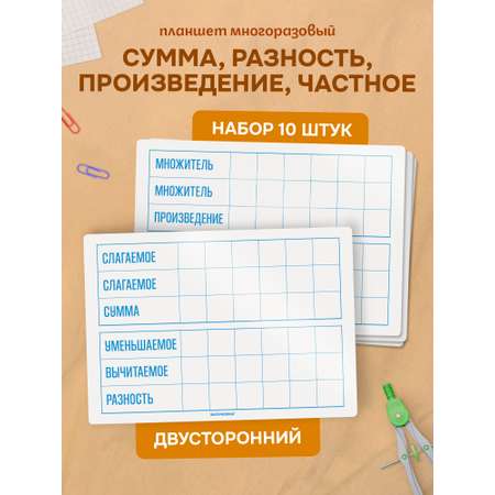 Многоразовый тренажер для решения примеров «Простые арифметические действия», набор из 10 штук. Размер каждого тренажера – А4 (21х29,5 см). Планшеты двусторонние: с одной стороны находятся таблицы «Слагаемое + слагаемое = сумма» и «Уменьшаемое – вычитаемое = разность», с другой – таблицы «Множитель х множитель = произведение» и «Делимое / делитель = частное». Система «Пиши-стирай» делает тренажеры многоразовыми. Набор тренажеров подойдет для уроков математики у учеников начальной школы. Поставляется в брендированной коробке из плотного картона. Это защитит планшеты при транспортировке.