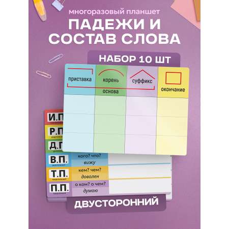 Многоразовый тренажер для уроков русского языка в начальной школе, набор из 10 штук. Размер каждого планшета-тренажера – А4 (21х29,5 см). Планшеты двусторонние: с одной стороны находится тренажер для деления слова по составу, с другой – таблица для склонения слова по падежам. Обе стороны оснащены подсказками по теме и полем для записи. Система «Пиши-стирай» делает тренажеры многоразовыми.