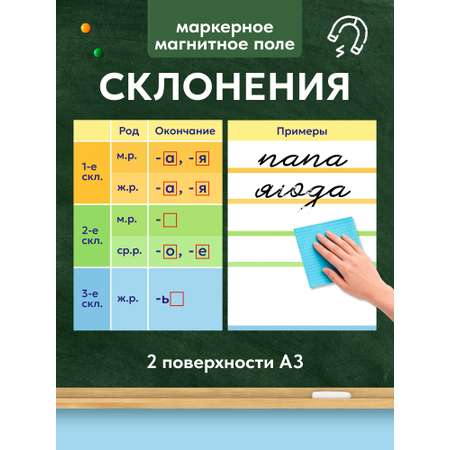 Маркерное магнитное поле «Склонения» - это набор из двух гибких магнитных листов размера А3 (42×29,7 см). Поля легко стыкуются друг с другом и образуют поверхность размером 42х60 см. Магниты многоразовые - можно писать и стирать множество раз. Подходят для наглядного объяснения склонений на уроках русского языка.