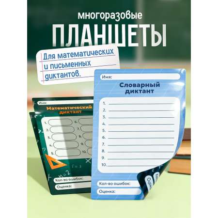 Набор "Диктанты" состоит из 10 многоразовых планшетов размера А5 (21×14,8 см). С двух сторон планшета находятся поля для словарного и математического диктанта. С помощью словарного диктанта учитель сможет провести контроль знаний по русскому языку, в частности по орфографии. Такой способ проверки учит запоминать написание и развивает грамотность. Математический диктант – это также полезный инструмент для закрепления материала. Ребенок на слух или, смотря на задания на доске, пишет ответы к задачам и примерам на планшете. Это помогает развивать скорость, внимание и навыки счёта.
