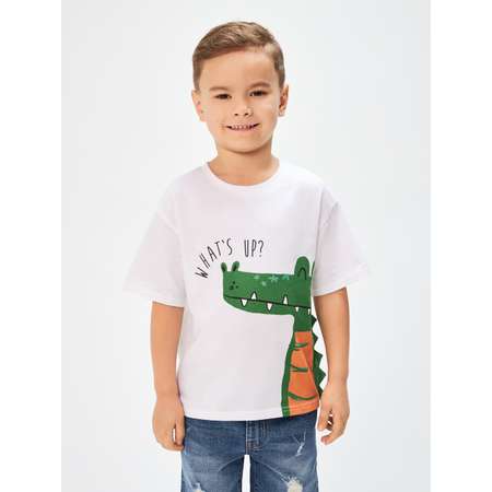 Детская белая футболка с объемной деталью — это необычная модель для создания ярких образов. Футболка для мальчика изготовлена из принтованного трикотажного полотна, которое отлично подходит для длительного ношения. Изделие посадки комфорт отличается приспущенной линией плеча, а также увеличенными объемом и длиной рукава. Такой крой дарит возможность легко двигаться, что особенно ценят активные мальчики. Удобная округлая горловина не будет мешать при одевании. Спереди расположен яркий принт с крокодилом и надписью "WHAT'S UP? " [англ. - "Как дела?"], который дополнен по боковому шву объемным текстильным гребнем. Модель представлена в двух цветах: белом и желтом. Стилизуйте футболку в повседневном образе с джинсовыми шортами (20130550001) и удобной обувью.
