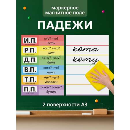 Многоразовый тренажер «Падежи» на магнитной основе состоит из 2 полотен размера А3 (42х29,7 см). Полотна ставятся встык и их общий размер составляет 42х59,4 см. На магнитах уже обозначены строчки с названиями падежей и вспомогательные вопросы. Ученикам нужно лишь правильно просклонять по падежам заданное учителем слово и вписать его в пустые строки на магните.