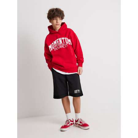 Черные шорты для мальчика — универсальная и практичная модель, которая подойдет для занятий спортом и создания стильных образов. Широкие шорты изготовлены из хлопкового футера с петлями на изнанке, благодаря чему они подходят для длительного ношения. Модель свободной посадки дарит легкость движений и удобство в ношении. Эластичный пояс на резинке регулируется шнурком, который обеспечивает комфортную и надежную посадку для разных типов телосложения. Практичности изделию добавляют карманы, расположенные по бокам. По низу шорты украшает контрастный принт с надписью "MAIN FORCE | IMBALANCE" [англ. — Главная сила | Дисбаланс"]. Шорты для мальчика подойдут для урока физкультуры, занятий в секции, а также для активного отдыха и расслабленных спортивных образов на каждый день. Модель представлена в двух вариантах.