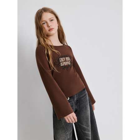 Лонгслив с рукавами клеш для девочки представляет собой модный айтем для создания изящных образов. Лонгслив изготовлен из трикотажного полотна, которое приятно на ощупь. Модель посадки regular предполагает приталенный крой со стандартной линией плеча. Утонченный штрих придают расклешенные длинные рукава. Широкая округлая горловина не мешает при одевании. Лонгслив украшен спереди принтом с растительным узором и надписью "Свет мой, зеркальце", отсылающим к популярной сказке. Дополнительный блеск придает россыпь серебристых стразов. Стильный коричневый цвет модели позволит создавать интересные повседневные образы. Лонгслив со стразами для девочки составит отличный лук с трендовыми широкими джинсами. Модель представлена в двух цветах: коричневом и белом.