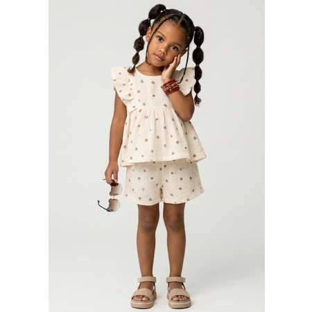 Комплект для девочки включает в себя: футболка для девочки и шорты для девочки. Ткань - муслин. Легкая, дышащая, отлично подойдет для жаркой погоды.