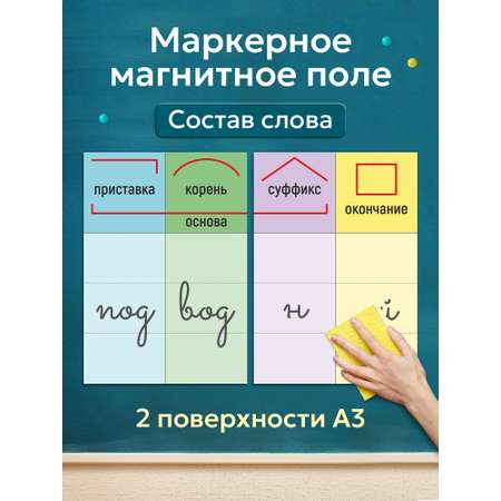 Магнитно-маркерное поле состоит из двух полотен размера А3 (42х29,7 см). Полотна ставятся встык и их общий размер составляет 42х59,5 см. Используются как дополнительный материал для школьной доски при разборе слова по составу. На магнитах уже обозначены зоны приставки, корня, суффикса и окончания. Ученикам нужно лишь разделить слово по частям и вписать их в необходимые графы на поле.
