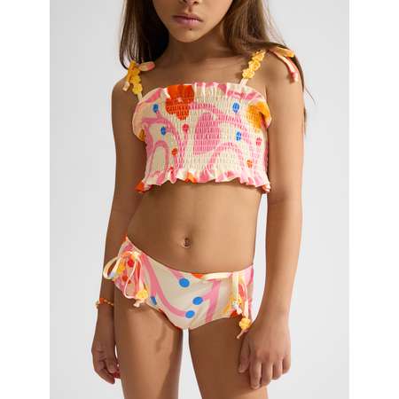 Купальник раздельный выполнен из мягкой ткани с защитой от солнца UPF50+. Материал быстро сохнет, хорошо пропускает воздух и подходит для чувствительной кожи ребёнка. Купальный костюм удобно надевать и снимать. Сборки на резинку лифа и плавок обеспечивают удобную посадку, которая не сковывает движения и поддерживает комфорт даже при длительной носке. Декоративные украшения на лямках лифа для девочки создают нежный акцент и делают модель более нарядной.