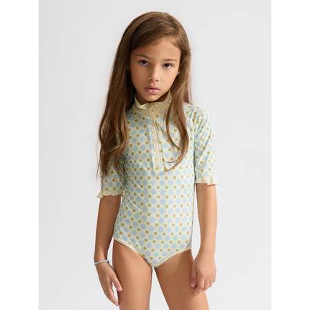 Купальник слитный выполнен из мягкой ткани с защитой от солнца UPF50+. Материал быстро сохнет, хорошо пропускает воздух и подходит для чувствительной кожи ребёнка. Модель с рукавами защищает от ультрафиолета. Застёжка на молнии облегчает переодевание. Изделие без резинок обеспечивает комфорт при движении. Декоративные оборки создают нежный акцент и делают модель более выразительной.
