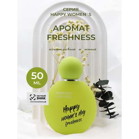 Парфюмерная вода женская премиум качества с содержанием стойких эфирных масел в количестве 30%. Спрей HAPPY WOMENS FRESHNESS 50 мл - роскошная восточно-цветочная композиция. Сладость аромата крайне ненавязчивая, а нежная, не кричащая, но жутко манкая и вкусная. Аромат ассоциируется с бельгийскими шоколадом, с конфетой из молочного шоколада с мягкой ягодной начинкой. Вы пьёте кофе со сливками, откусываете эту конфету, она буквально тает во рту, .а рядом свами в вазе стоят свежесрезанные пионы и они сначала пахнут резко и навязчиво бьют в нос, но затем ароматы шоколада и цветов смешиваются и вот он, тот самый вкус! Приятный и женственный, но не в классическом смысле, тут женственность сладкая, современная и кокетливая. Цветочно-ягодная шоколадная конфета. Основные аккорды парфюмерной воды там переплетаются терпкие ноты черной смородины с легкой грушей. Парфюм покоряет ярким изысканным шлейфом. Парфюм производства Турция.