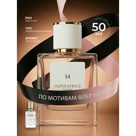 Представляем вам новые женские духи Imperatrice France 14. Парфюмерная вода для женщин императрица отличается оригинальностью и изысканностью, стойкостью и утонченностью. Необычные женские ароматы создают неповторимый исключительный образ. Духи женские с нежным и манящим букетом, постепенно раскрывающимся и подчеркивающим чувственность и легкость. Духи понемногу открываются, верхние ноты цитрусовые, ветивер добавляет яркости и бодрости. Отличительной особенностью данного аромата является восхитительный, женственный цитрусовый свежий аккорд в сочетании с гурманными нюансами на бархатистом амбровом фоне. Цветки жасмина, ириса - средние ноты, придают уникальную утонченность, немного пьянящий и дурманящий глубокий, зеленый, восковой аромат. Ветивер и пачули составляют теплую базу необыкновенно похожую по настроению на летнее утро. Ванильные духи вызывают приятные ассоциации, связанные с чем-то вкусным, например мороженым или десертом. Похожи на Флер Наркотик. Туалетная вода женская сладкая, как и селективный парфюм, пробуждает гормоны радости и счастья. Нишевая парфюмерия универсальна, подойдет и для дневного гардероба, и как стойкие духи на вечер. Для полноценного раскрытия парфюмированная вода наносится на пульсирующие участки кожи вблизи сосудов, которые будут постоянно его подогревать - на шею за ушами, под колено, на запястье, локтевые сгибы, волосы. Парфюм женский великолепно раскрывается как в холодное время года, так и в летние жаркие дни. По мотивам Ex Nihilo Fleur Narcotique (флер наркотик)