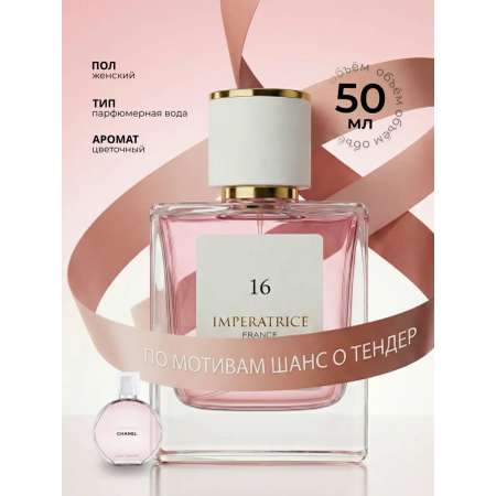 Представляем вам новые женские духи Imperatrice France 16. Парфюмерная вода для женщин императрица отличаются оригинальностью и изысканностью, стойкостью и утонченностью. Необычные женские ароматы создают неповторимый исключительный образ. Духи женские с нежным и манящим букетом, постепенно раскрывающимся и подчеркивающим чувственность и легкость. Парфюм императрица 16 понравится легкостью фруктовых ноток, духи с гиацинтом, ирисом и мускусом немного сладковаты в самом начале, затем переходит в благоухание жасмина с совершенно необыкновенным грейпфрутом, и база окутывает крепковатой древесно-мускусной пеленой кедра и амбры. Верхние ноты: Айва и Грейпфрут; Средние ноты: Гиацинт и Жасмин; Базовые ноты: Мускус, Ирис, Вирджинский кедр и Амбра. Аромат для тела унисекс, а также подходит для любого времени года. Женские ароматы постепенно раскрываются и радуют обладательниц стойкостью. Ванильные духи вызывают приятные ассоциации, связанные с чем-то вкусным, например мороженым или десертом. Похожи на шанс о тендер. Туалетная вода женская сладкая, как и селективный парфюм, пробуждает гормоны радости и счастья. Нишевая парфюмерия универсальна, подойдет и для дневного гардероба, и как стойкие духи на вечер. Для полноценного раскрытия парфюмированная вода наносится на пульсирующие участки кожи вблизи сосудов, которые будут постоянно его подогревать - на шею за ушами, под колено, на запястье, локтевые сгибы, волосы. Парфюм женский великолепно раскрывается как в холодное время года, так и в летние жаркие дни. По мотивам CHANCE EAU TENDRE