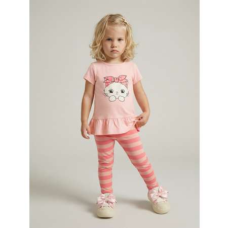 Комплект футболка и легинсы для девочки с рисунком котика. Изготовлен из ткани кулирка 100% хлопок. Лосины - кулирка с добавлением лайкры. Футболка для девочки персикового цвета , облегающие легинсы в полоску. Комплект подходит для прогулок, для дома и детского садика. Комплект для девочки отлично подойдет для лета, ребенку в нем будет комфортно.
