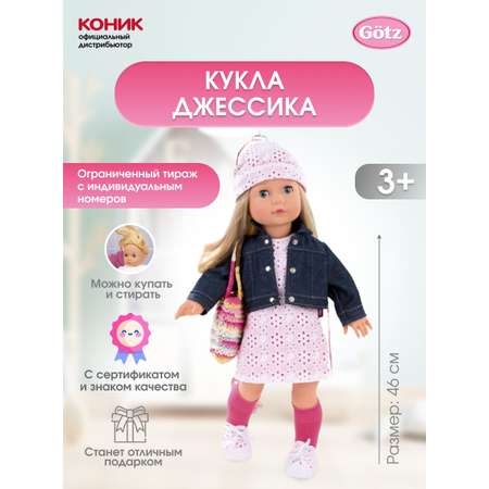 Кукла Gotz с виниловым подвижным телом подходит для активных игр дома и на улице. У игрушки светлые густые волосы, которые позволяют делать прически, расчесывать и мыть ей голову. Джессика одета в стильный наряд, состоящий из розового с белым платья и джинсовой курточки. На голове у нее - шапочка в тон платью, на ножках - белые кеды и розовые гольфики. В комплекте с куколкой имеется яркая вязаная сумочка.