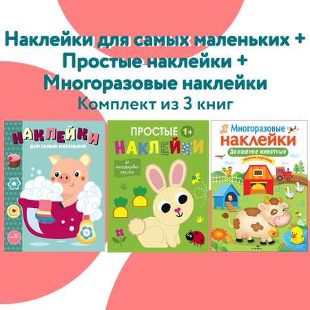 В комплект входят :Наклейки для самых маленьких Вып.21 Поросенок;Простые наклейки Вып 1.Зайчик;Мои первые наклейки многоразовые Домашние Животные