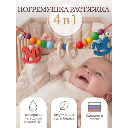 Яркая и оригинальная деревянная растяжка станет отличным аксессуаром для коляски или кроватки новорожденного в стиле Монтессори. Игрушка выполнена из натурального дерева бука и березы, что гарантирует экологичность и безопасность для малышей. Все элементы покрыты гипоаллергенными красками на водной основе, что делает изделие полностью безопасным для детей даже при контакте с ртом и руками. Конструкция включает разноцветные тактильные бусины, две фигурки-качалки в форме лошадок, а также кольца и металлические подвесы-бубенцы, которые издают приятный звук при движении. Благодаря такой сенсорной и развивающей игрушке ребенок тренирует мелкую моторику, зрительное и слуховое восприятие, а также учится концентрировать внимание на интересных деталях.
