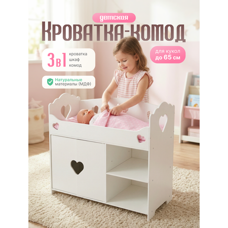 Кукольная кроватка 3 в 1 — это функциональный и стильный элемент мебели для юных любителей кукол. Она станет настоящим центром внимания в детской комнате, где маленькие хозяйки смогут заботиться о своих игрушках. Кроватка выполнена из качественных материалов (МДФ), что гарантирует её долговечность и безопасность. Эта игрушечная кровать включает в себя все необходимое для комфортной игры: уютное спальное место, шкаф для хранения аксессуаров и комод для игрушек. Этот комплект станет прекрасным дополнением к любой кукольной коллекции, позволяя детям создавать новые истории и приключения для своих любимых игрушек. Куклы и их одежда всегда будут под рукой, а благодаря продуманным размерам, кроватка легко впишется в пространство любой детской комнаты.